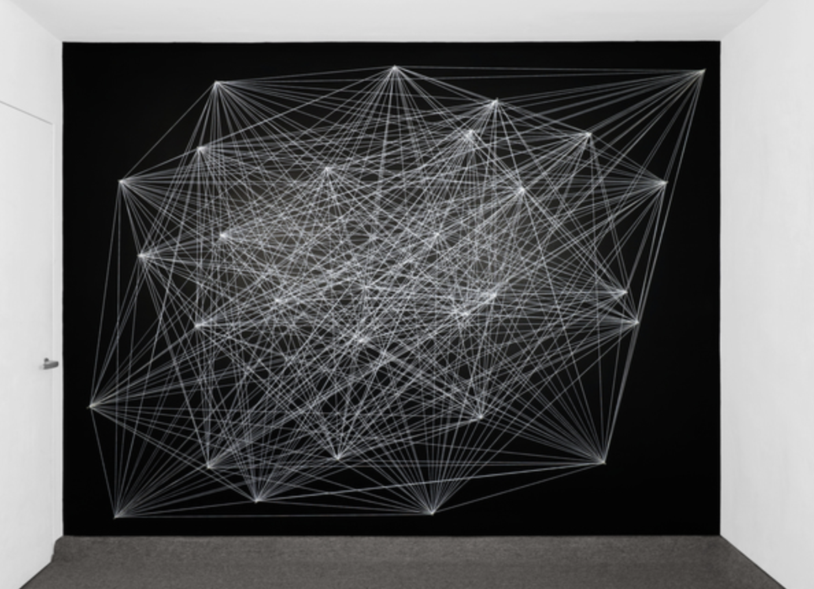 This is Sol Lewitt wall drawing #815 created in March 1997. I found this wall art interesting because the strings getting more concentrated in the center portray depth. Also where the strings meet allow your eyes to look at the whole thing more then just one place which creates movement. I also like the simplicity of the art being black and white.